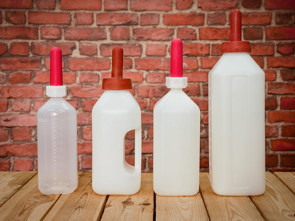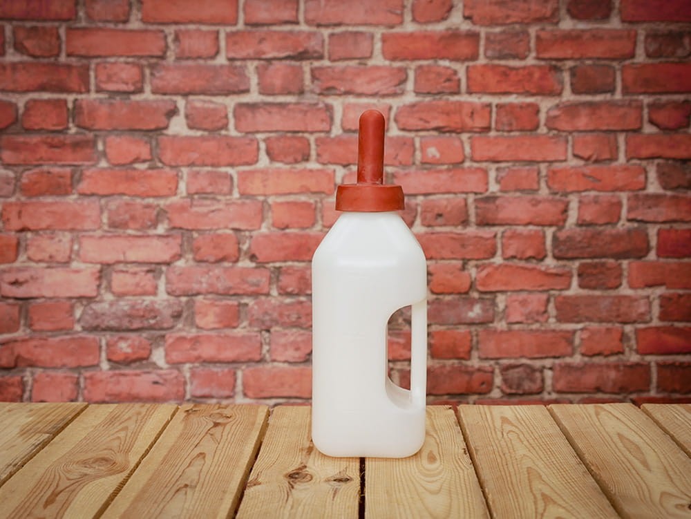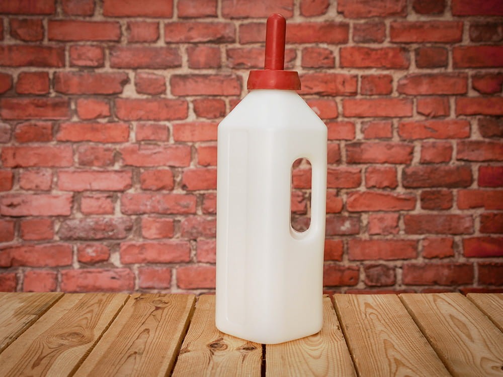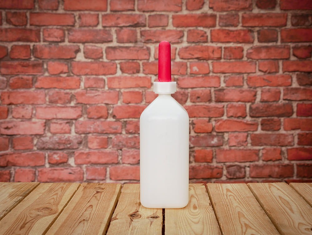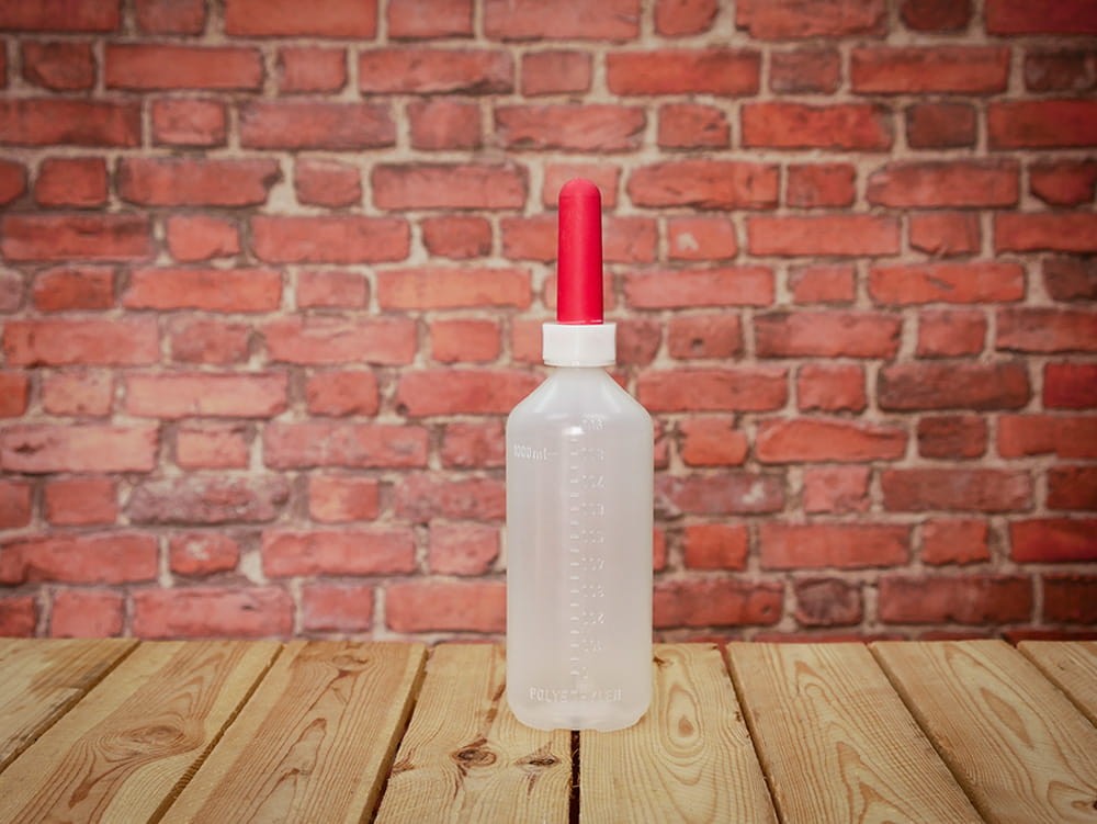 Fľaša s cumľom na dojenie teliat. S červeným cumľom a s mierkou na fľaši.