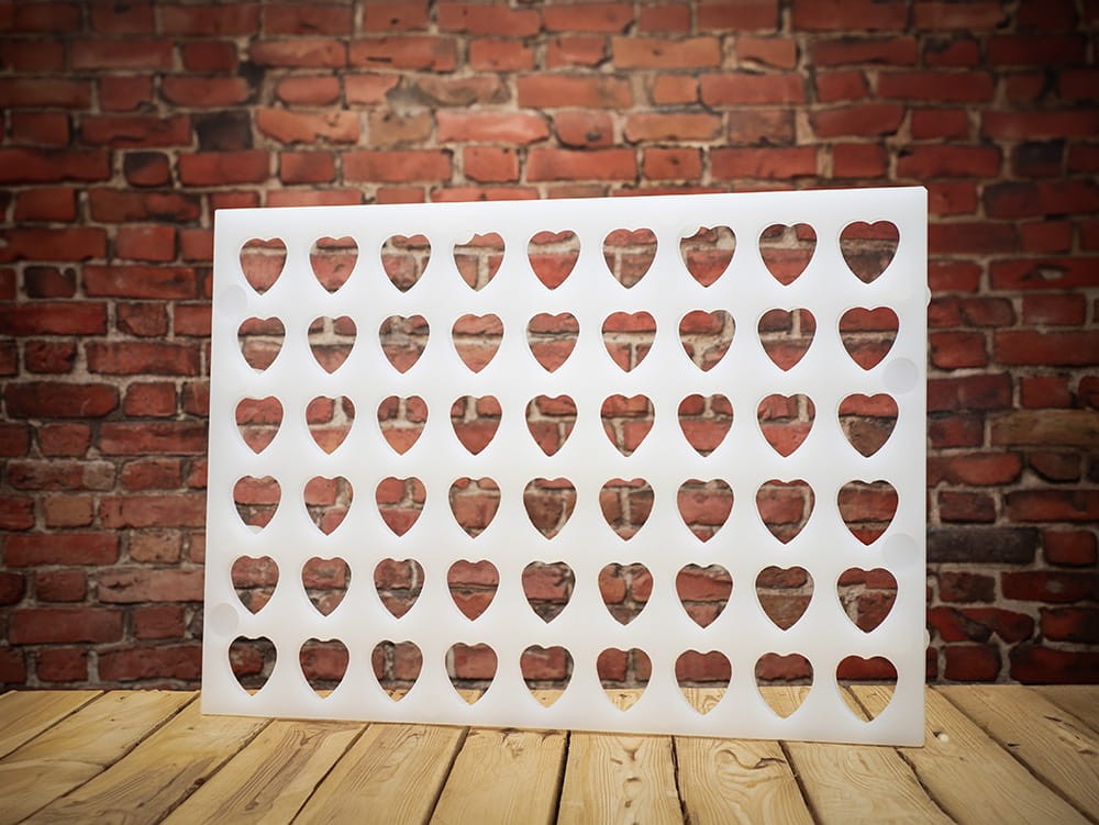 Stojan na nožičkách pod formy na syr, pozostávajúci z 54 otvorov v tvare srdiečka. Určený pre model: